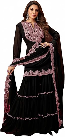 - Style: Straight Short Kurta Sharara Set || Work: Resham Embroidery Sequin Work